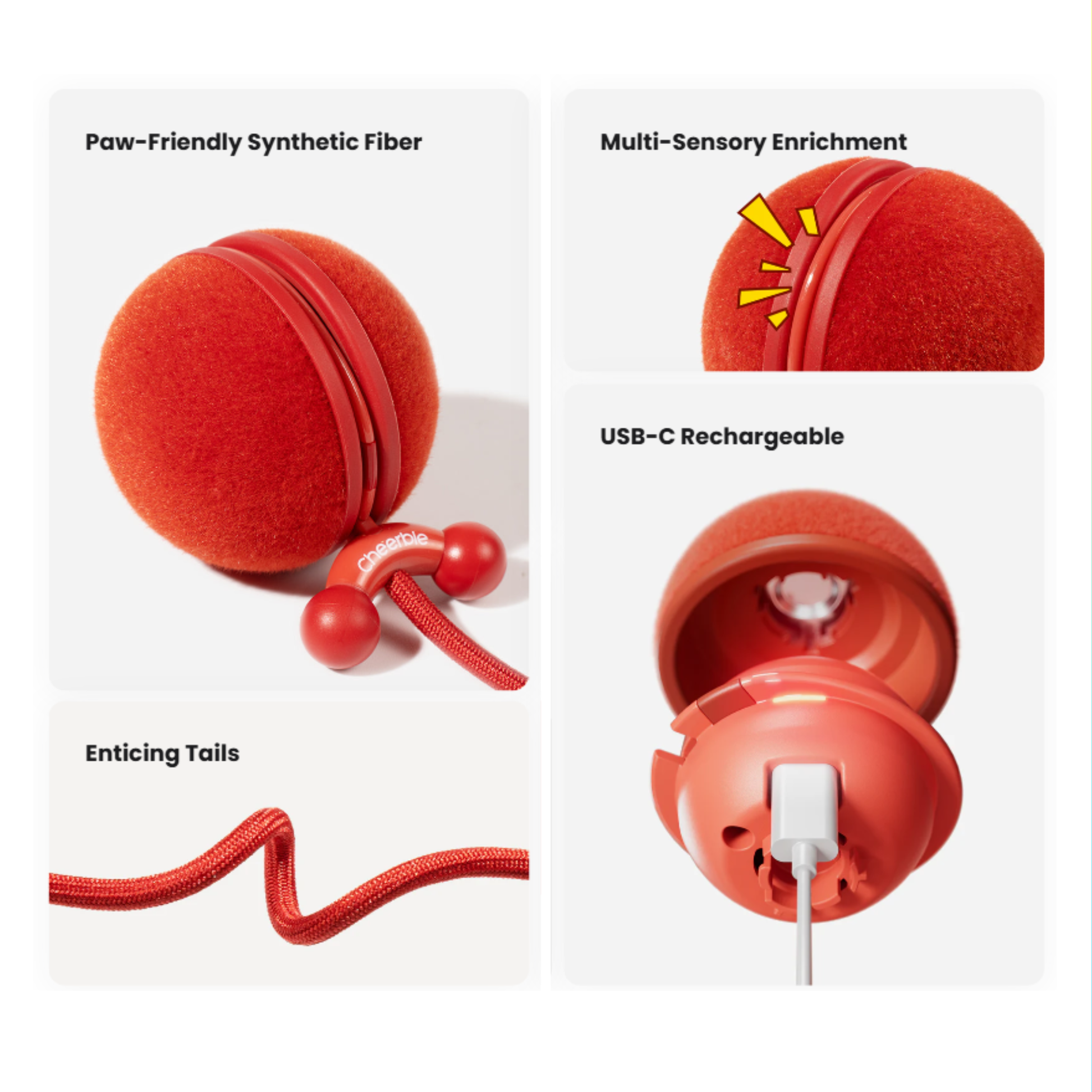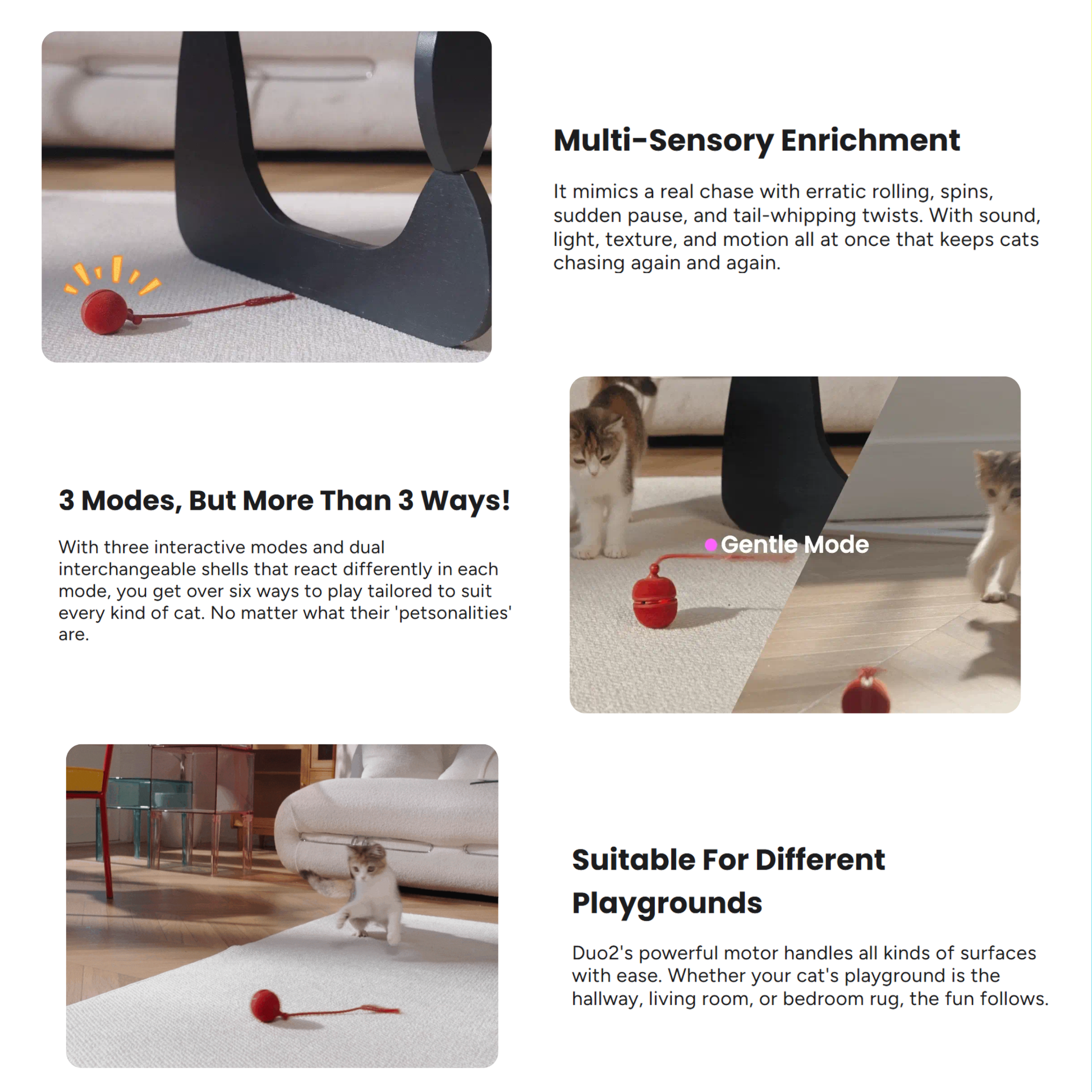 - Entices cats with sound, light, texture and motion all at once