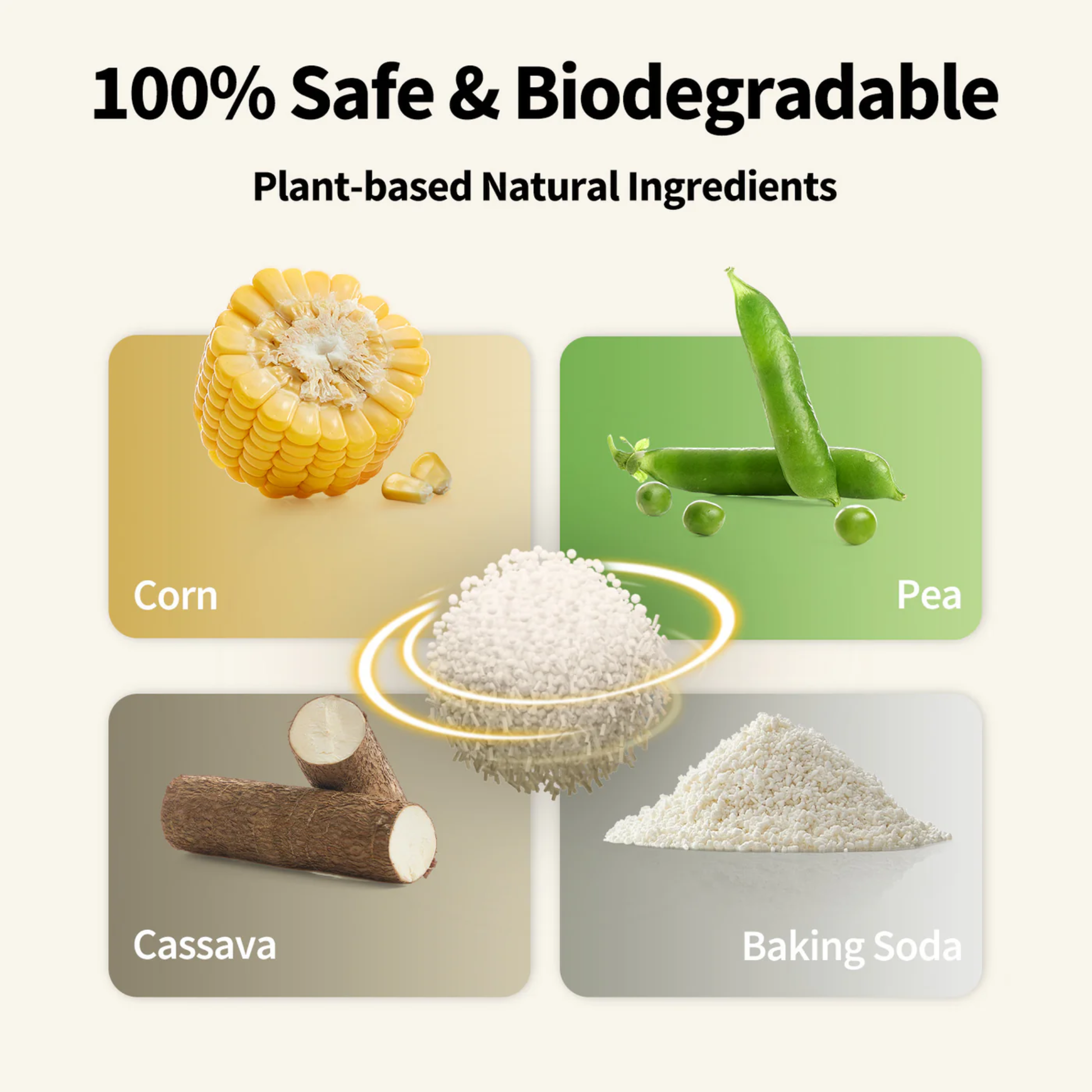 - Made of all-natural plant-based ingredients - corn, pea, cassava and baking soda