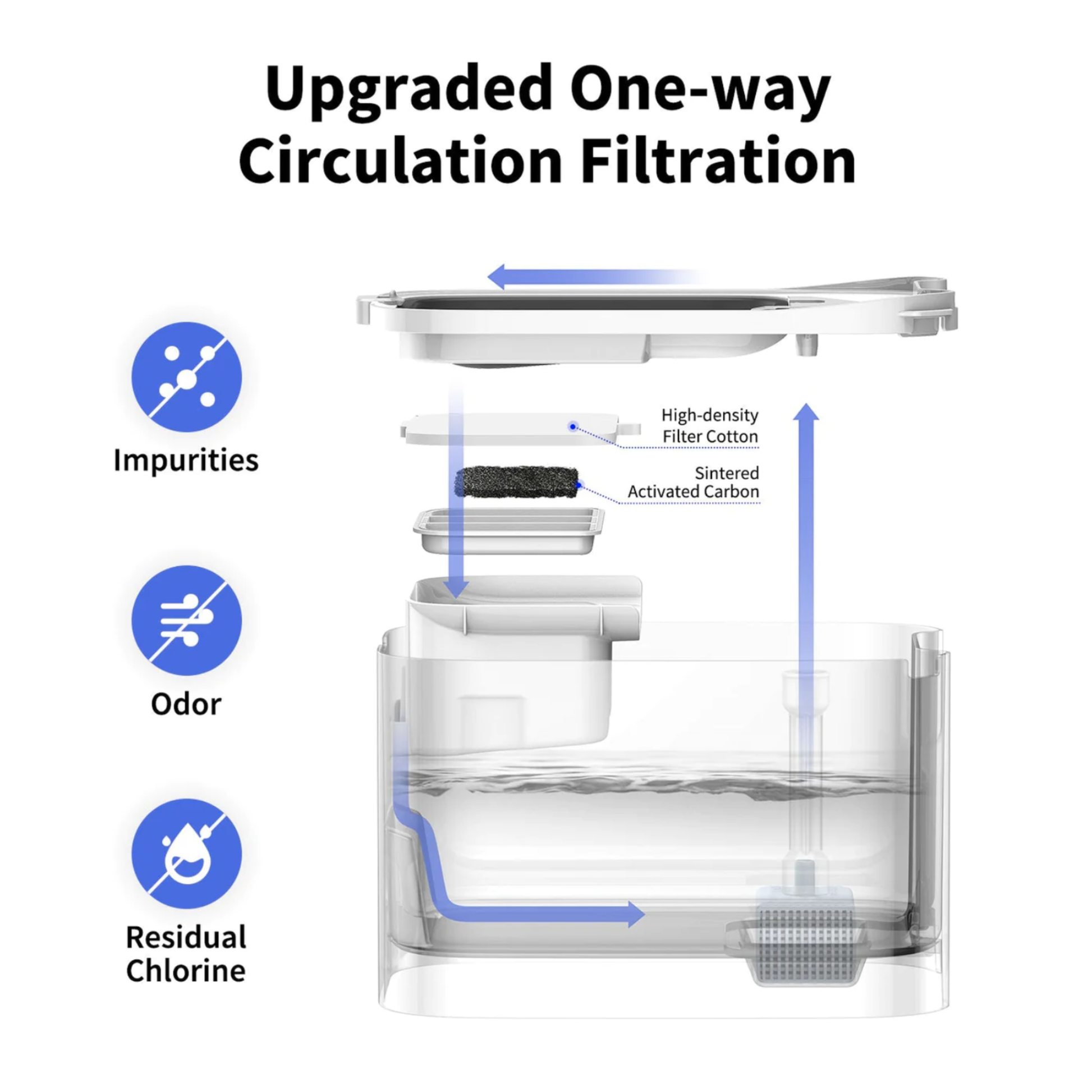 - Uses one way circulating filtration system, high density filter and sintered activated carbon to remove impurities such as hair and dust, eliminate odor and chlorine and improve water taste