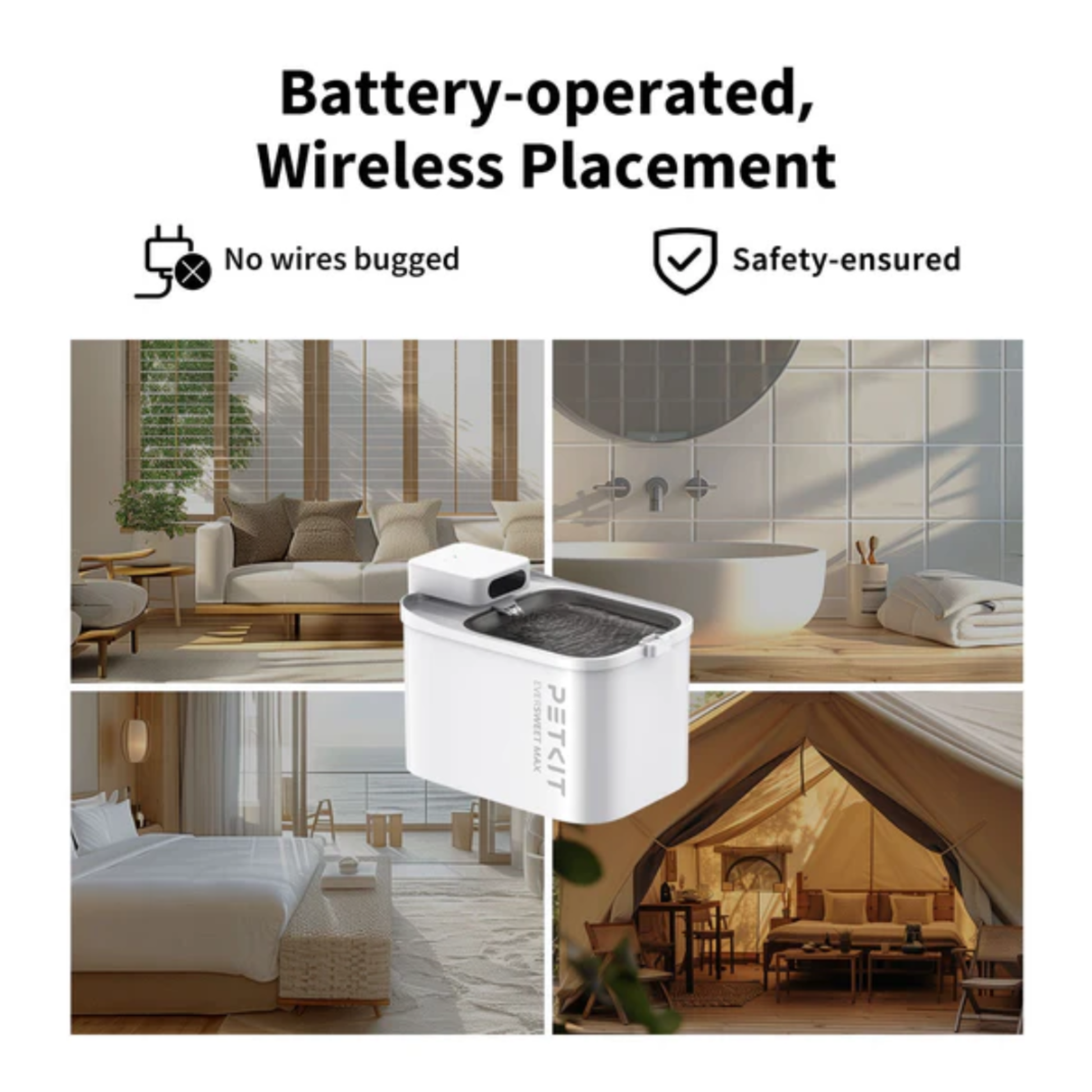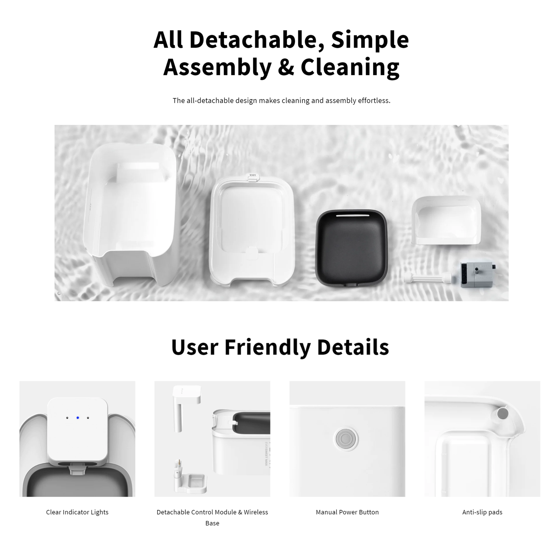 - Wireless Pump - wireless pump adopts magnetic induction power supply technology which eliminates any exposed wires to enhance electrical safety and includes anti-dry safety protection