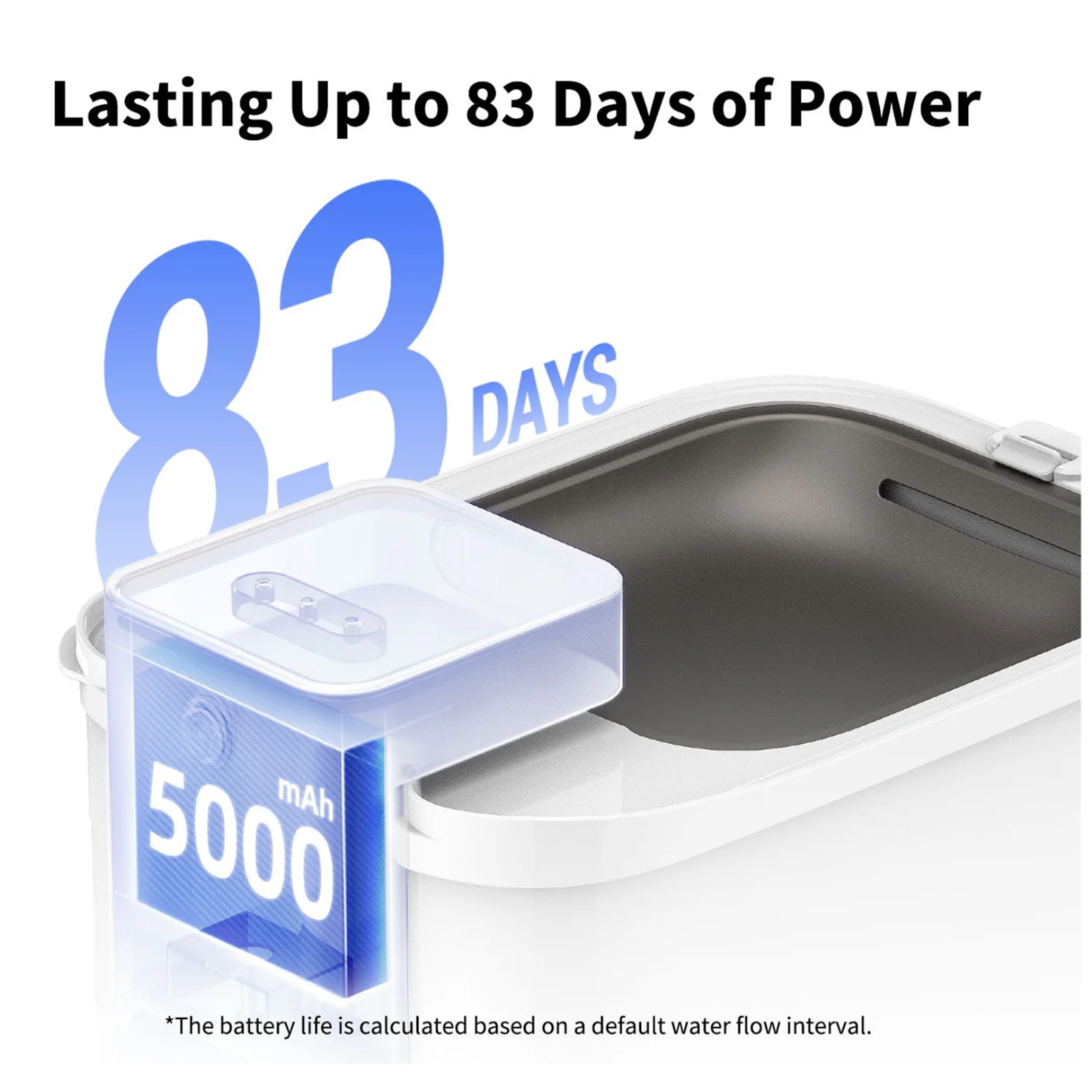 - Powerful 5000mAh battery can last up to 83 days on a single charge (when water flow is set at 25s/hr)
